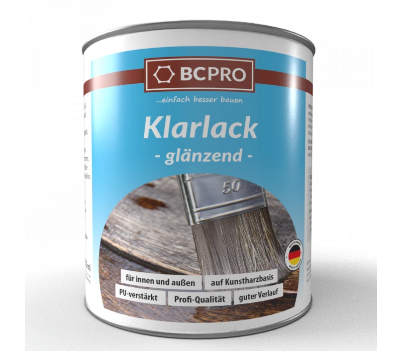 BCPRO Klarlack glänzend ist ein farbloser, lösemittelhaltiger Deckanstrich in Profi-Qualität für langlebige Beschichtungen auf Holz im Innen- und Außenbereich. Die Holzversiegelung schützt durch ihre Wetterbeständigkeit Holztüren, Gartenmöbel, Holztore und -vertäfelungen im Außenbereich vor äußeren Umwelteinflüssen.
