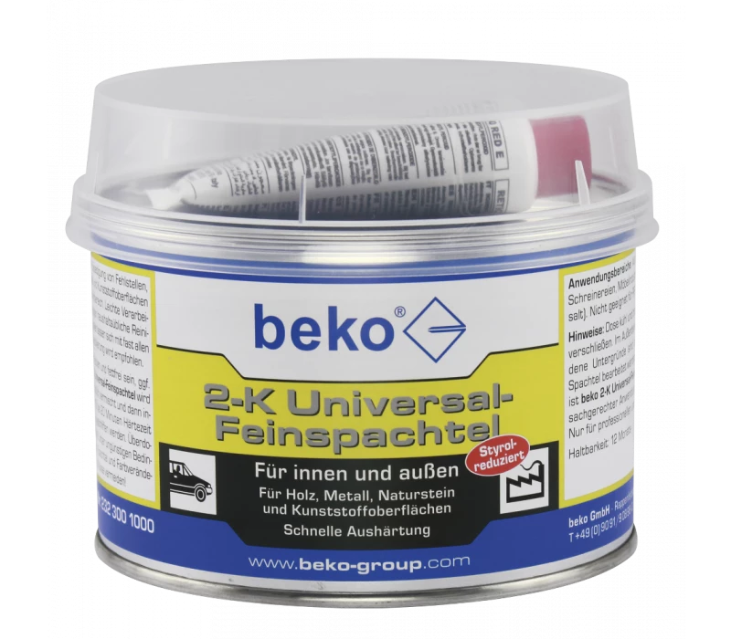 Die gewünschte Menge beko 2-K Universal-Feinspachtel wird mit ca. 2% Härterpaste (1 g Härter auf 50 g Spachtel) gründlich vermischt und dann innerhalb von 4 bis 5 Minuten verarbeitet. Nach weiteren 15 bis 20 Minuten Härtezeit kann beko 2-K Universal-Feinspachtel trocken oder nass geschliffen werden. Überdosierung von Härterpaste beschleunigt die Polymerisation nicht!