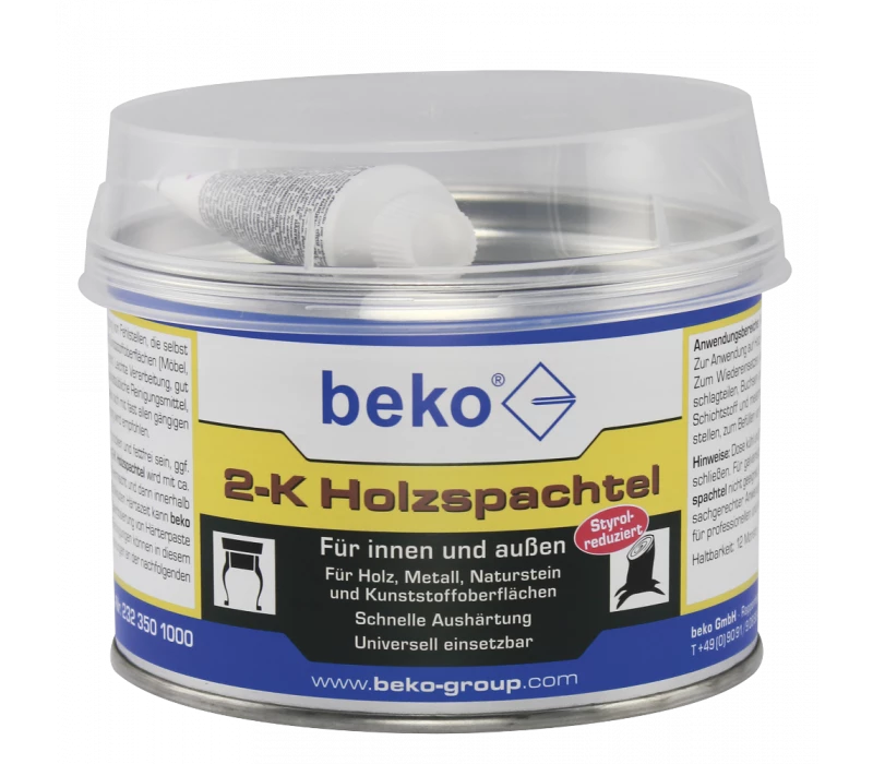 Die zu bearbeitende Fläche sollte sauber, trocken und fettfrei sein. Die gewünschte Menge beko 2-K Holzspachtel wird mit ca. 2% Härterpaste (1g Härter auf 50 g Spachtel) gründlich vermischt und dann innerhalb von 4 bis 5 Minuten verarbeitet. Nach weiteren 15 bis 20 Minuten Härtezeit kann beko 2-K Holzspachtel trocken oder nass geschliffen werden. Überdosierung von Härterpaste beschleunigt die Polymerisation nicht! Unter ungünstigen Bedingungen können in diesem Fall sogar Strukturschäden beim Spachtel und Farbveränderungen an der nachfolgenden Lackierung auftreten. Lufteinschlüsse vermeiden!