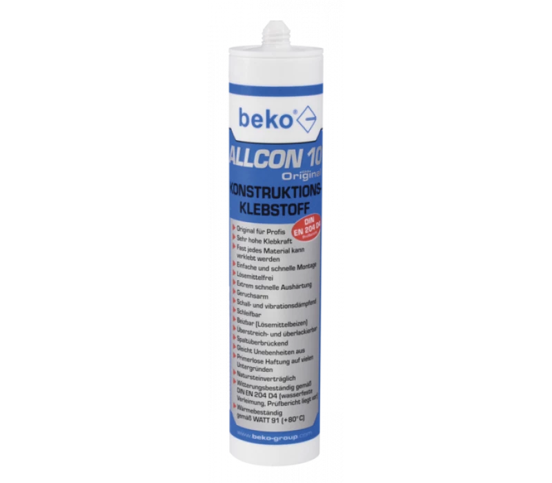 Alle glatten Materialien anschleifen, mit beko Allclean reinigen und leicht mit Wasser benetzen (ca. 20 g/m2). Teile innerhalb von 3 Minuten zusammenfügen. Bis zum Abbinden pressen. Wir empfehlen grundsätzlich bei allen Anwendungen Testverklebungen. Bei nicht fach- und sachgerechter Anwendung ist jede Produkthaftung ausgeschlossen. Nur für professionellen und industriellen Gebrauch.