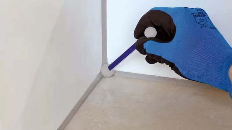 Anschließend wird der beko Fugenschnurz im ca. 45°-Winkel in der Ecke angesetzt und in alle drei Richtungen für einige Zentimeter gezogen.