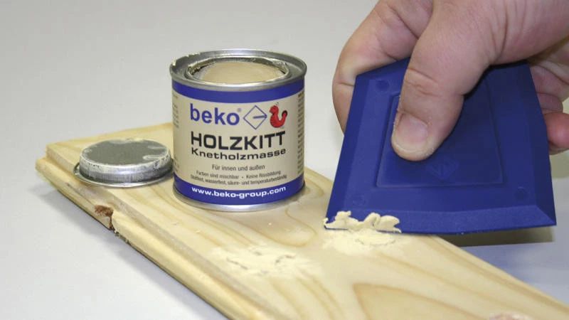 Die Reparaturstellen müssen sauber, fettfrei und trocken sein, ggf. mit Holzkitt Verdünner reinigen. Nach dem Auftragen von beko Holzkitt Knetholzmasse sollte die Oberfläche mit einem Glättespachtel geglättet werden. Tiefe Löcher oder Kerben in mehreren Schichten füllen. Vor Auftragen der nächsten Schicht sollte die darunter liegende Schicht trocken sein. beko Holzkitt Knetholzmasse ist nach dem Aushärten geruchlos, lässt sich wie Holz bearbeiten und nach dem Schleifen auch beizen oder überlackieren. Von Holzkitt Knetholzmasse verschmutzte Oberflächen mit Holzkitt Verdünner und einem festen Tuch reinigen. Zum Erweichen von gehärteter beko Holzkitt Knetholzmasse sollte der Holzkitt Verdünner in einem Verhältnis von maximal 1:20 (Verdünner : Knetholzmasse) je nach Konsistenz der Knetmasse zugegeben werden.