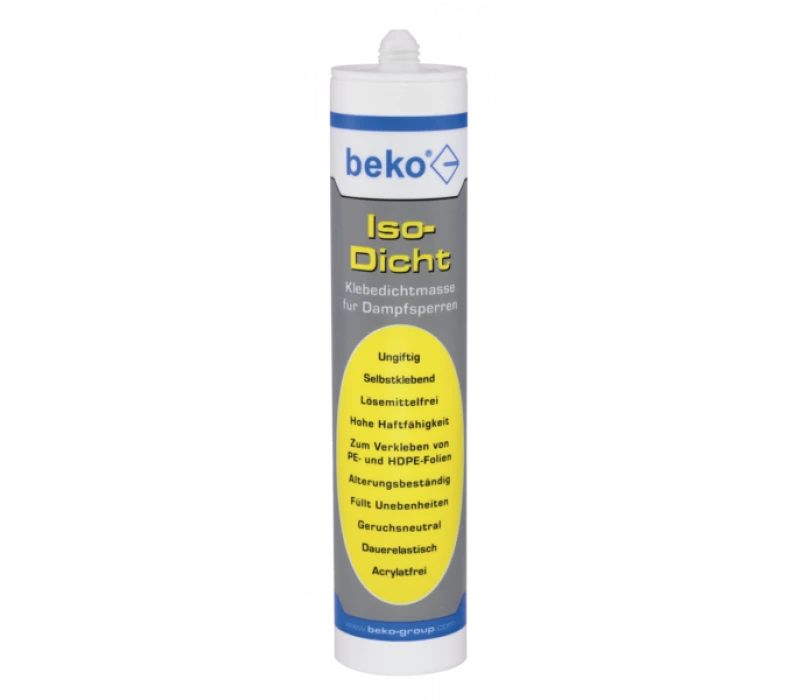 Die Haftflächen müssen fest, tragfähig, trocken, staub- und fettfrei sein. beko Iso-Dicht als eine ca. 4-8 mm dicke Raupe auf den Untergrund auftragen. Danach beko Iso-Dicht für eine optimale Haftung 30 Minuten trocknen lassen. Die Folie locker, nicht auf Zug, verlegen und leicht in die Raupe drücken. Nicht verpressen. Während der Trocknung die Folie nicht auf Zug belasten. Haftung und Verträglichkeit, vor allem auf Kunststoffen, sollten vor der Verarbeitung geprüft werden.