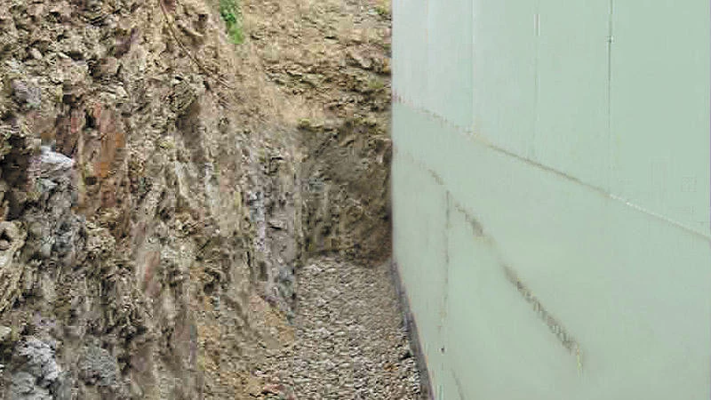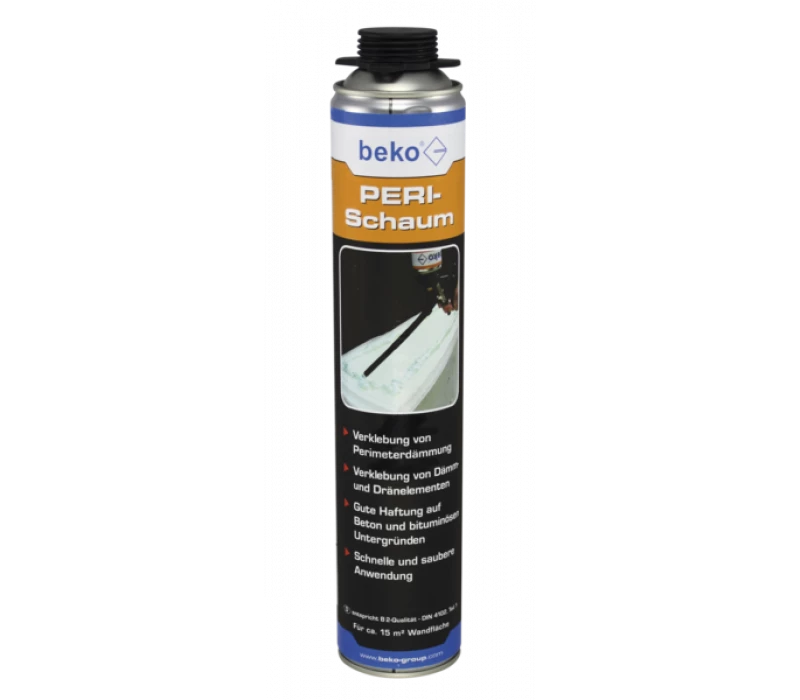 Die Dämmplatte zügig und fest an die äußere Kellerwand drücken (Reaktionszeit je nach Luftfeuchtigkeit, max. 10 Minuten) und vor Abrutschen sichern. Offene Fugen an der Dämmung mit beko PERI-Schaum schließen. Die Verklebung dient zum Fixieren von Dämmplatten.