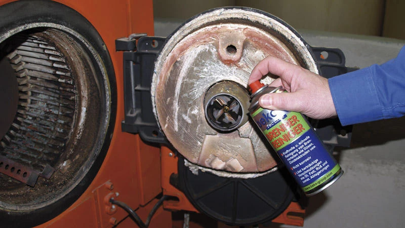 Zum Entfernen von Öl-, Fett-, Ruß- und sonstigen Verschmutzungen an Brennerteilen wie Düsenstöcken, Stauscheiben, Gebläserädern, Innengehäusen, Zündelektroden sowie Kesselverkleidungen und anderen Metallteilen