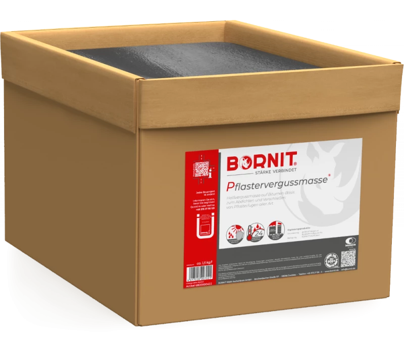 BORNIT®-Pflastervergussmasse ist ein Vergussstoff auf Bitumenbasis mit mineralischen Füllstoffen. Die Pflasterfugenmasse ist eine aufschmelzbare und heiß zu verarbeitende Vergussmasse. Qualität gemäß ZTV Fug-StB 01 und geprüft nach TL/TP Fug-StB01.