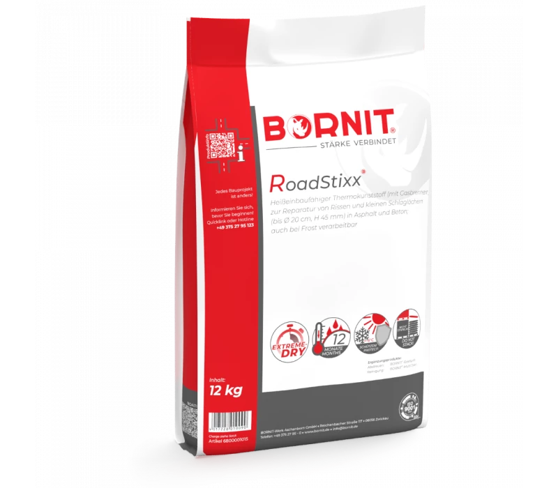 BORNIT®-RoadStixx ist ein aufschmelzbares Alkyd-Thermoplastgranulat. Durch das Erwärmen auf ca. +220 °C wird eine sehr gute Haftung zu den Altbelägen erreicht. Nach dem Einbau sind die reparierten Stellen nach kurzer Zeit überfahrbar und weisen ausgezeichnete Standfestigkeiten auf.