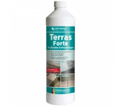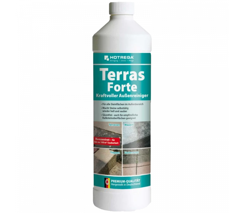 HOTREGA Terras forte ist ein nachhaltig wirkender Kraftreiniger auf Aktivchlorbasis zur mühelosen Renovierung aller Steinbeläge im Außenbereich.