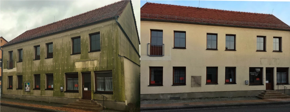 Sie entfernt diese in einem Arbeitsgang von Außenfassaden und Innenwänden.