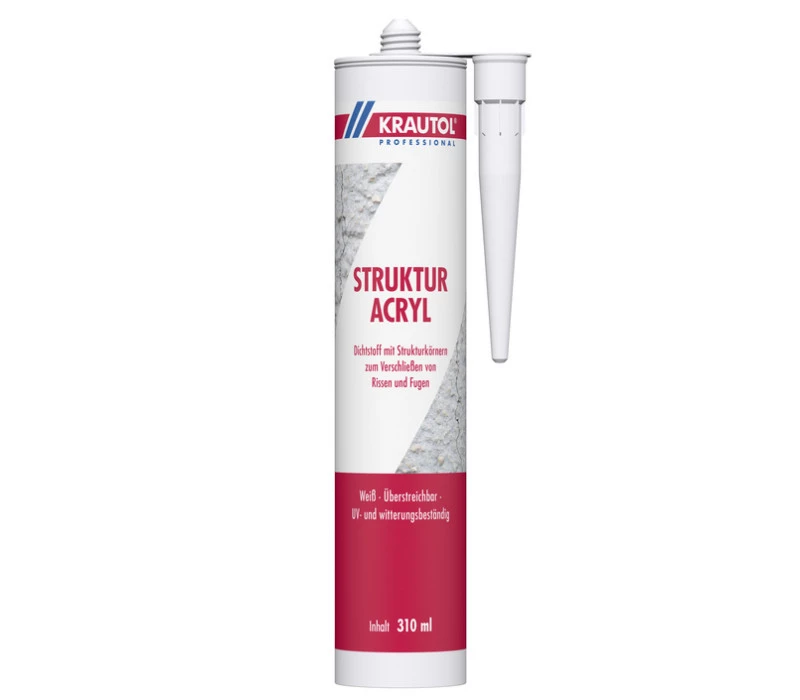 KRAUTOL STRUKTUR ACRYL kann zum Schließen von Rissen und Beschädigungen in Struktur- und Reibeputzen verwendet werden. Es eignet sich außerdem auch zum Abdichten von Anschlüssen und Fugen mit geringer Dehnungsbeanspruchung, sofern diese nicht ständiger Belastung durch Feuchtigkeit ausgesetzt sind, z. B. zum Verfugen von Tür und Fensteranschlüssen, Fensterbänken, Rolladenkästen, Deckenanschlüssen, Leichtbauwänden, Einbaumöbeln, Putzflächen, Verkleidungen und Kunststoffrohren.
