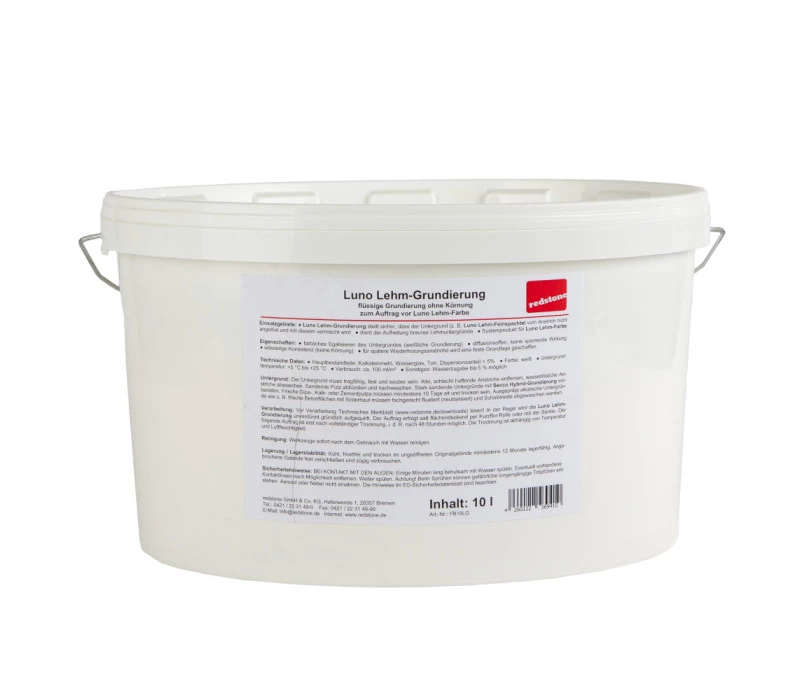 redstone Luno Lehm-Grundierung ist bei trockener, kühler und frostfreier Lagerung im ungeöffneten Originalgebinde mindestens 12 Monate lagerfähig. Angebrochene Gebinde sind fest zu verschließen und zügig zu verbrauchen.