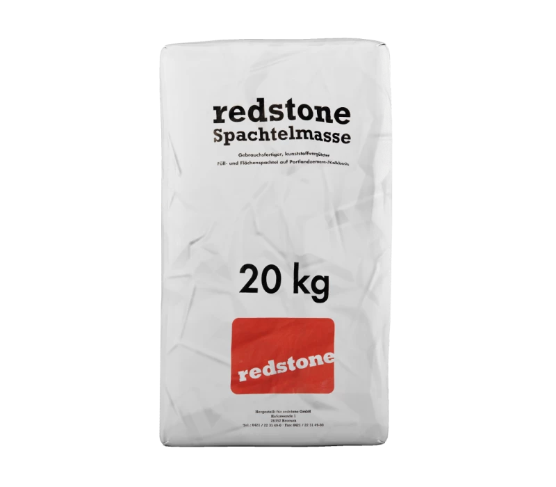 Die redstone Spachtelmasse (20 kg-Sack) und mind. 16 l sauberes Wasser werden mit einem langsam laufenden Rührwerk intensiv und homogen vermischt, bis eine knotenfreie und geschmeidige Masse entsteht. Nach einer Reifezeit von ca. 5 Minuten nochmals aufrühren. Der Auftrag erfolgt in einer Schichtdicke von 1 – 4 mm (Rissgefahr bei größeren Schichtdicken). Zur Armierung der Spachtelschicht wird ggf. das redstone Putzgewebe 165 bzw. Putzgewebe 070 als Armierungseinlage deckend in die frische Spachtelmasse eingelegt (frisch in frisch, Spachtelstärke mit Gewebeeinlage ca. 3 – 4 mm)