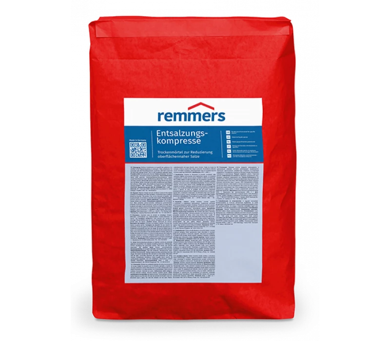 1 Sack mit ca. 10-11 Liter destilliertem oder deionisiertem Wasser anmischen und in plastischer Konsistenz auf die zu entsalzende Fläche auftragen (Schichtdicke: 15-30 mm), nach ca. 3 Wochen Einwirkungsdauer die erhärtete Remmers Entsalzungskompresse vorsichtig entfernen, anschließend nochmaliger Auftrag und gleiche Einwirkungsdauer. Je nach Umgebungsbedingungen, bei beheizten Innenräumen oder Zugluft in jedem Fall, mit Folie o.ä. vor zu schneller Austrocknung schützen. Weitere Hinweise finden sich im WTA-Merkblatt „Kompressenentsalzung“, Nr. 3-13-01/D.