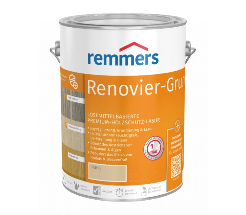 Vor Gebrauch gründlich aufrühren, auch während der Verarbeitung! Renovier-Grund mit einem Acryl-Flächenstreicher für Wasserlacke in Faserrichtung auftragen. Nach Trocknung erfolgt die nachfolgende Zwischen- und Schlussbeschichtung mit Remmers Langzeit-Lasur UV oder Wetterschutz-Lasur UV.