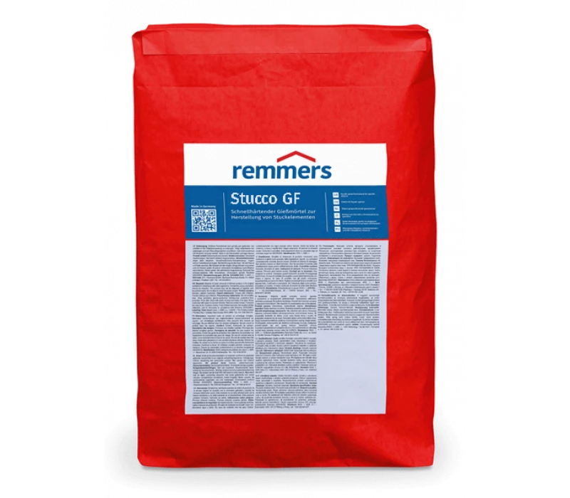 Remmers Stuckmörtel GF ist ein werkgemischter, mineralischer Trockenmörtel, der nach Anmischen mit Wasser gebrauchsfertig ist und hydraulisch schnell erhärtet, er ermöglicht damit eine schnelle Formenwiederverwendung.