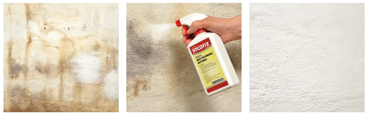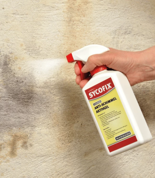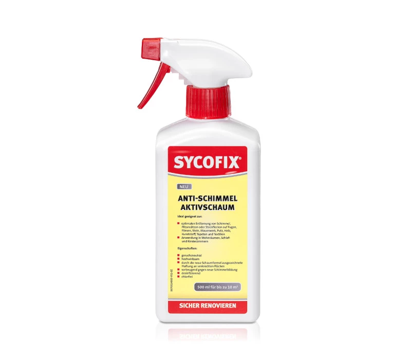 SYCOFIX® Anti-Schimmel Aktivschaum entfernt zuverlässig und sicher Schimmel, Pilzansätze oder Stockflecken von Fugen, Fliesen, Stein, Mauerwerk, Putz, Holz, Kunststoff, Tapeten und Textilien.