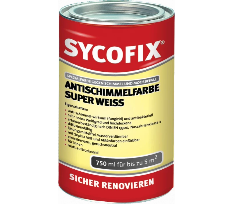 SYCOFIX Antischimmelfarbe ist eine hochdeckende, emissionsarme, weiße Dispersionsfarbe mit Filmschutz, die hervorragend geeignet ist als vorbeugender Anstrich oder Sanierungsanstrich auf schimmelgefährdeten oder bereits schimmelbefallenen Innenflächen aus Putz, Beton, Mauerwerk, Dispersionsfarbanstrichen, Gipskartonplatten, festhaftende Tapeten u.ä.
