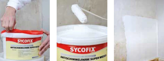 Für eine optimale Schutzwirkung sind zwei Anstriche mit SYCOFIX Antischimmelfarbe super weiß unverdünnt erforderlich.