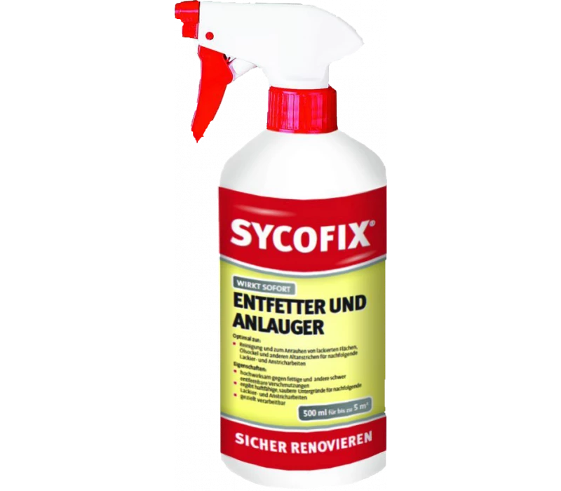 Sycofix Entfetter und Anlauger ist hervorragend geeignet zum Entfernen stark fetthaltiger Schmutzschichten sowie zum Aufrauen lackierter Flächen und Ölsockel zur Herstellung von sauberen, haftfähigen Untergründen für Nachfolgearbeiten wie Lackieren, Streichen oder auch Tapezieren.