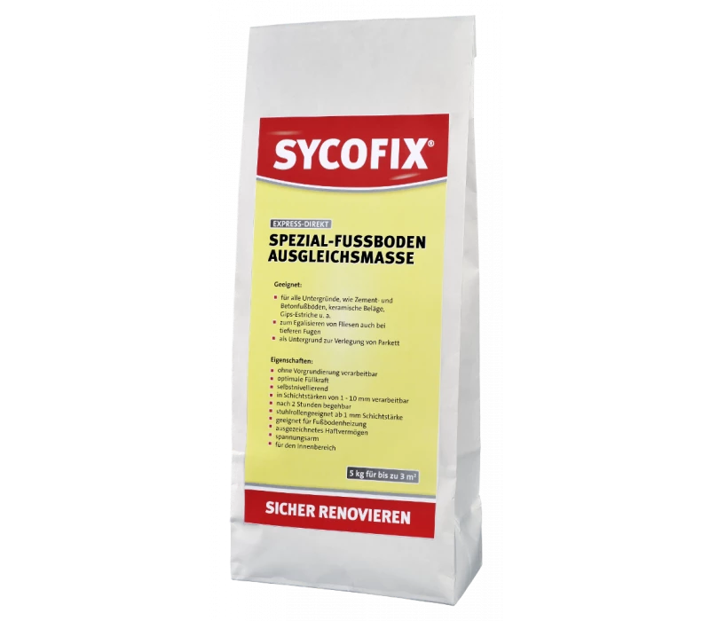 SYCOFIX® Spezial-Fußbodenausgleichsmasse ist der optimale Untergrund für Verklebungen von textilen Bodenbelägen, Linoleum, PVC- und CV-Belägen, Kautschuk-Belägen, Kork und Parkett.