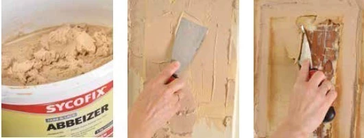 SYCOFIX® Farb- und Lack Abbeizer wird ca. 3 mm dick mit einer Spachtel gleichmäßig und blasenfrei aufgetragen, dabei ist besonders auf Fugen und Rillen zu achten.