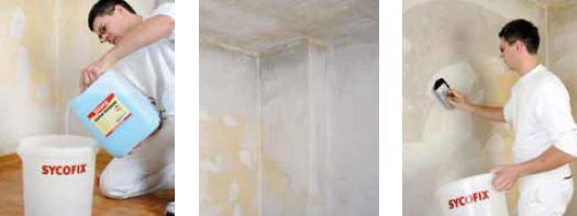 Lose Putze und alte bzw. nicht tragfähige Anstriche (Leimfarben) und Tapeten sind zu entfernen. Dazu empfehlen wir SYCOFIX® Tapetenablöser extra-stark.