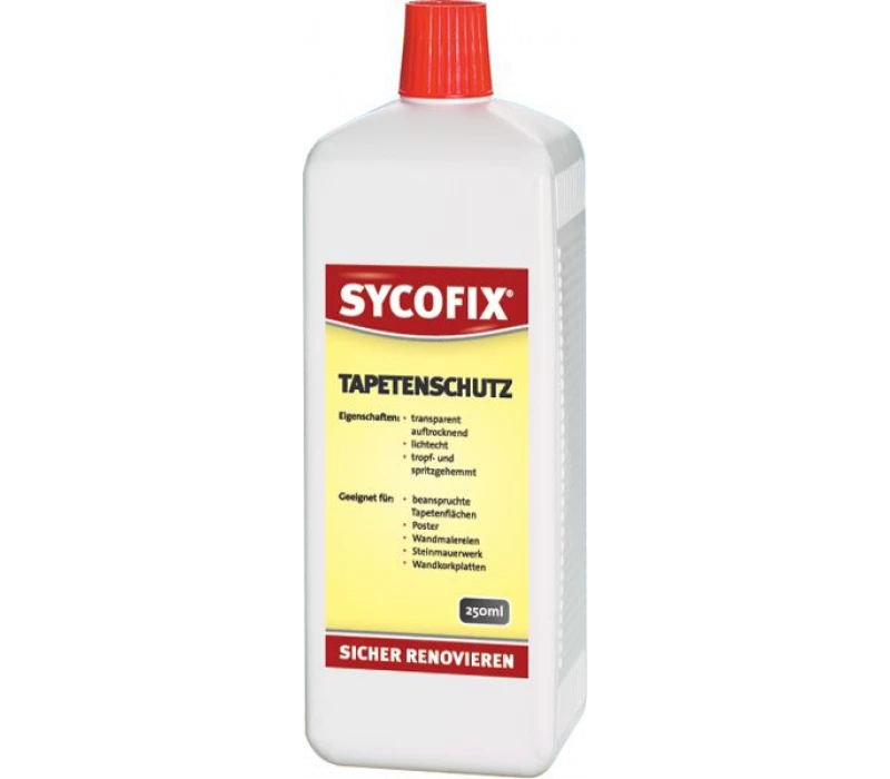 SYCOFIX® Tapetenschutz ist ein lösemittelfreier, waschfester, farbloser, nicht vergilbender Schutzüberzug für beanspruchte Tapetenflächen, Poster, für Anstriche mit Wachslasuren, Wandfarben und Wandkorkplatten.