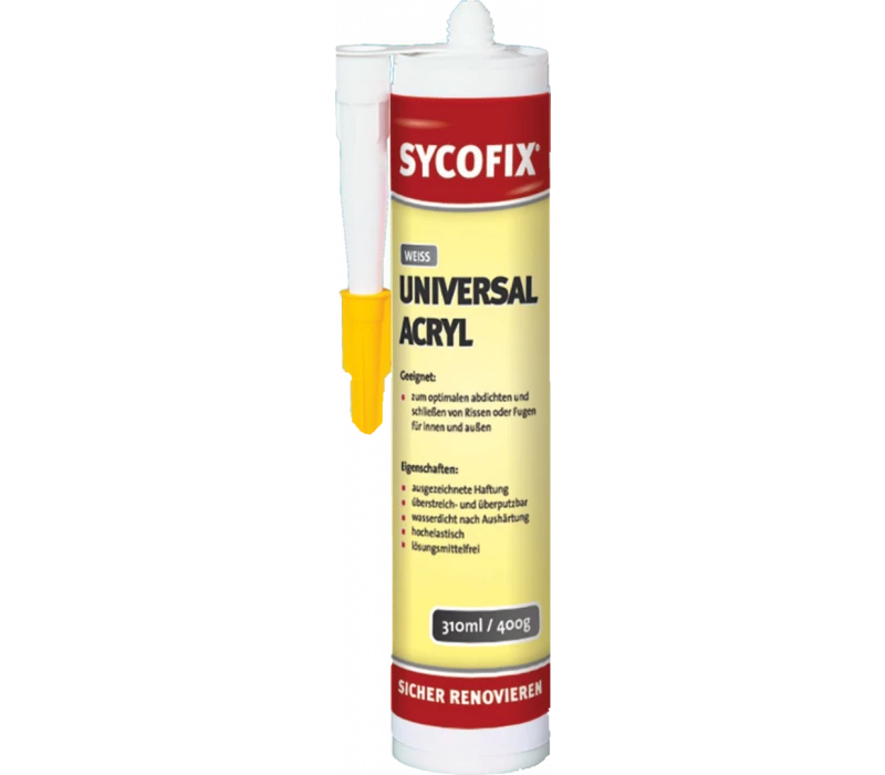 SYCOFIX Universal Acryl ist optimal geeignet zum Schließen von Rissen und Fugen in Wänden, Decken und Fassaden, sowie zum Abdichten von Anschlussfugen und gering belasteten Dehnungsfugen, wie z.B. an Fenstern, Türen, Fensterbänken, Treppen, Klima- und Lüftungsanlagen.