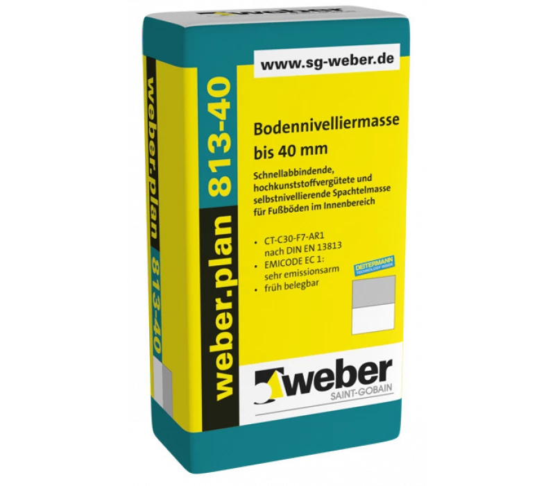 weber.plan 813-40 ist eine selbstverlaufende, schnellabbindende Bodenausgleichsmasse zum Ausgleichen formstabiler Untergründe wie z.B. Zementestriche, Calciumsulfatestriche, Heizestriche, Elektrofußbodenheizungen und Beton. Das Produkt ist außerdem für nachfolgende Oberbeläge wie z. B. Keramik- und Naturwerksteinbeläge, Parkett ,Teppichböden, PVC-Beläge oder Linoleum geeignet. Für weitere Informationen lesen Sie bitte unter Detailinformationen zum Produkt weber.plan 813-40 nach.