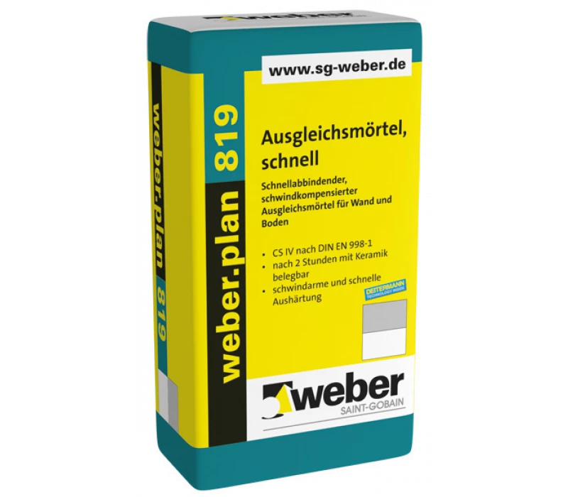 weber.plan 819 ist ein standfester, schwindkompensierter Ausgleichsmörtel zum Ausgleichen und Ausbessern von Wand- und Bodenflächen im Innen- und Außenbereich. Des Weiteren ist er auch als vollflächiger Putz, auch im Schwimmbadbau einsetzbar. Geeignete Untergründe: Beton (ausreichend alt, fachgerecht nachbehandelt, im Schwimmbeckenbau mindestens 6 Monate alt), Mauerwerk der Festigkeitsklasse >6 (z. B. Kalksandstein, Betonstein), Kalkzement- und Zementputze ab einer Festigkeitsklasse CS IV, Zement- und Schnellzementestriche.