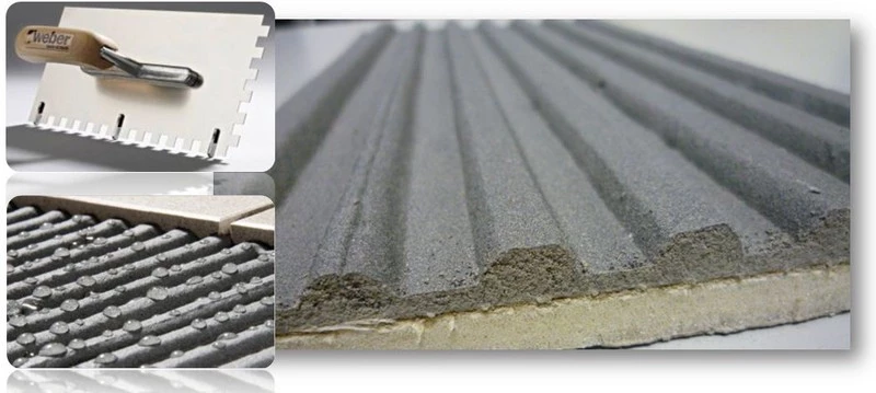 Mit der Glättkelle eine Kontaktschicht auf dem Verlegeuntergrund aufbringen, anschließend mit einem Zahnspachtel in einem Winkel von 45° – 60° ein gleichmäßiges Klebebett aufziehen. Zur vollsatten Verlegung empfehlen wir das im Buttering-Floating-Verfahren durchzuführen. Bei dieser Verlegeart verringert sich das Risiko von Hohlstellen.
