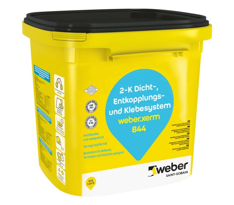 weber.xerm 844 ist ein hochflexibles, schnell- und reaktivabbindendes, 2- komponentiges System aus Fliesenkleber und Abdichtung, das im ausgehärteten Zustand wasserdicht, frost-, sulfat-, UV-, und alterungsbeständig ist. Der weber.xerm 844 eignet sich zur Herstellung einer Verbundabdichtung unter keramischen Belägen bei Feuchtigkeitsbeanspruchungsklassen A0, B0, A und B im Innen- und Außenbereich. Des Weiteren kann mit dem gleichen Material die nachfolgende Belagsverlegung auf der zuvor abgedichteten Fläche erfolgen.
