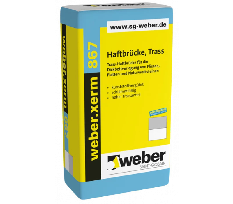 weber.xerm 867 ist eine trasszementhaltige Haftbrücke zur Dickbettverlegung von Steinzeug- und Feinsteinzeugfliesen sowie von verfärbungsunempfindlichen Naturwerksteinbelägen im erdfeuchten Mörtelbett. Die Haftbrücke wird eingesetzt zwischen Estrich- und dem Dickbettmörtel sowie zwischen dem Dickbettmörtel und Belag.